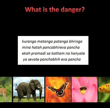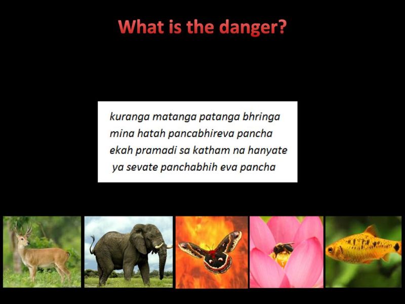 Adi Shankaracharya talks about the danger that lurks in the five senses, which threatens all human beings. By identifying totally with the body and indulging in experiences through all the five sensory pathways, a human is vulnerable and worse off compared to the animals as the latter are enslaved predominantly by only one sense organ.